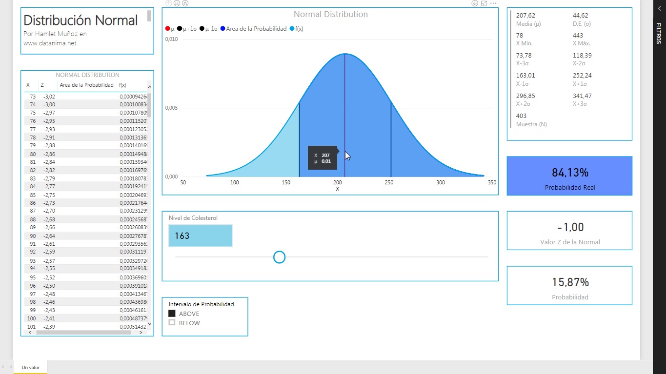 Este panel funciona como material educativo, puede editarse y usarse para cualquier base a la que se le pueda ajustar una distribución Normal.