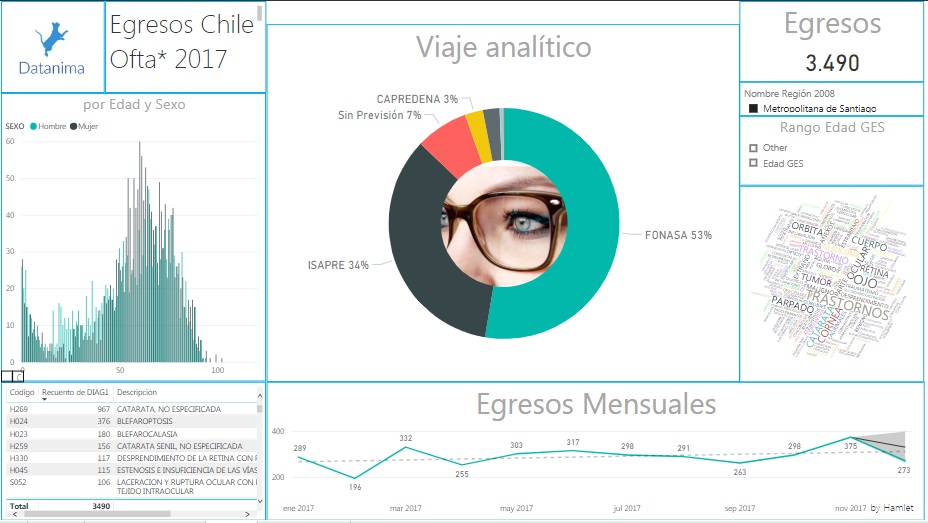 Un ejemplo para explorar y obtener insights sobre los egresos de determinadas cirugías. A la derecha del título "Viaje analítico" verás unas flechas, dale click a la segunda (la que apunta hacia abajo) de modo que cambie de color, luego haz click en cualquier color del gráfico para bajar un nivel y explorar el panel! Cuando llegues al nivel más bajo puedes volver a subir con la primera flecha (la que apunta hacia arriba)