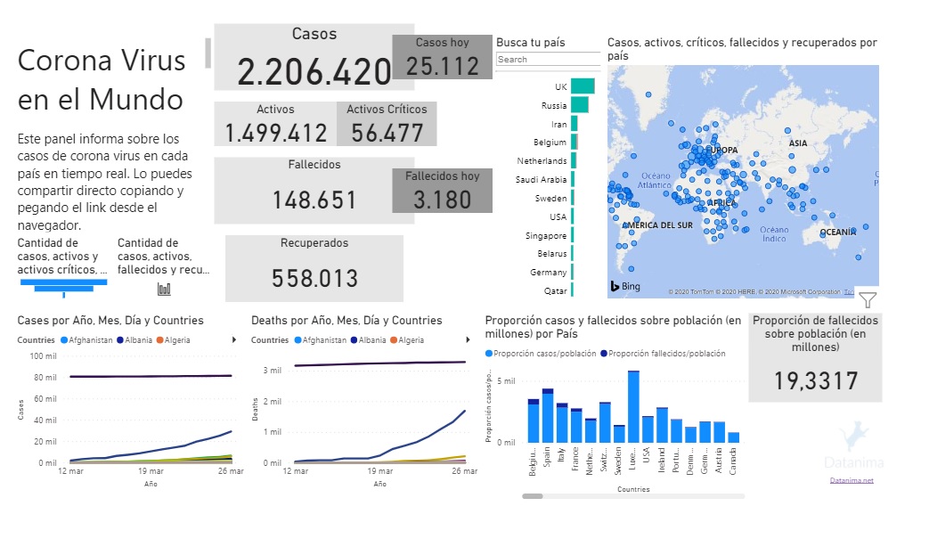 Las visualizaciones son dinámicas y puedes navegar en ellas, por ejemplo: 1. Prueba buscando tu país donde dice "busca tu país", puedes escribirlo en la barra de "search", luego dale clic. 2. Inmediátamente los gráficos reaccionarán a tu selección y te dirán cuántos casos de esa país existen. Además los casos de hoy y los lamentables fallecimientos. 3. Investiga con los paneles para realizar distintos filtros y saber más. Necesitamos democratizar esta información para tomar conciencia y coordinar medidas para superar esta crisis mundial.